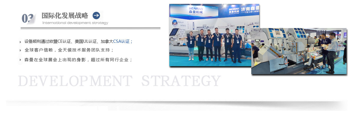 “森曼機械”作為全球門窗設(shè)備供應(yīng)商,本著"seaman"精神,勇立潮頭,拼搏創(chuàng)新,以爭做行業(yè)為目標,在行業(yè)前輩發(fā)展的基礎(chǔ)上,努力學(xué)習,積極進取。目前公司產(chǎn)品涵蓋塑料門窗設(shè)備、鋁合金門窗設(shè)備、鋁幕墻設(shè)備、鋁木復(fù)合門窗設(shè)備及中空玻璃設(shè)備五大種類,近百個品種。公司產(chǎn)品銷售至全國各地及東南亞、非洲、東歐、北美等幾十個國家和地區(qū)。在這個競爭激烈的年代,我們正努力使我們的產(chǎn)品!
